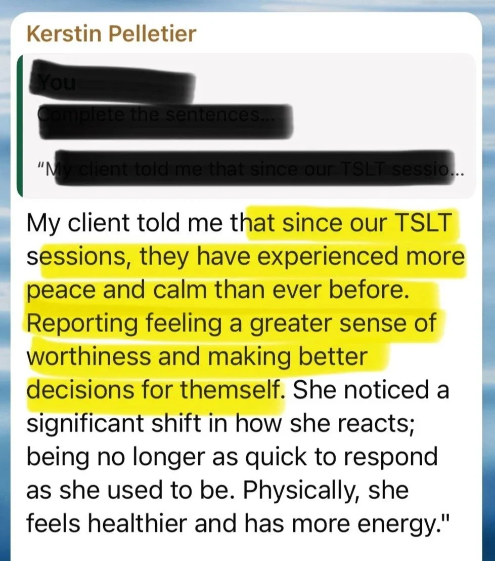 Transforming the lives of both facilitator and client alike, TSLT gets in the room results from the very first session, even with typically treatment resistant clients.